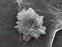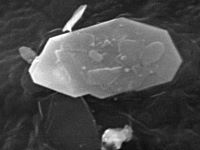 The picture at left is one of several particles of pure bismuth found on the tie. These particles could be from a material processing plant or potentially from glitter makeup. Their source is currently unknown.