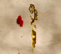 These red and amber particles were found in several places on the tie. They were subsequently identified using Raman spectroscopy as pigment particles. These are common pigments and were not investigated further.