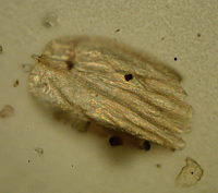 This is a scale from an insect wing. Experts were contacted to determine if this scale could be identified, but we were told the huge scope of scales in nature makes this impossible.