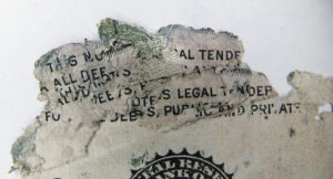 The remaining individual bills can also provide some idea of the stacks alignment during burial. Reviewing the available pictures, it is noted that the bills all degraded from the edges in and all in similar proportions around the entire bill. Had some bills been rotated out of alignment, they would have presented more surface area to the degradation processes in the sand and some corners would have been proportionally more deteriorated. This is not apparent in the majority of the Cooper bills.