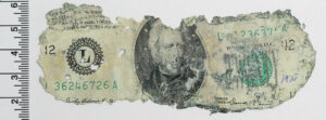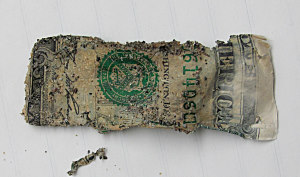 The money removed from the burial test after 33 months showed almost no degradation (Fig. 6). Damage to the edges was mostly shrinkage and contraction from drying out. This suggests the bills need a bio-active, oxygenated environment to induce bacterial breakdown of the paper. The environment in the jar would have been principally anoxic and did not mimic a natural sand burial.