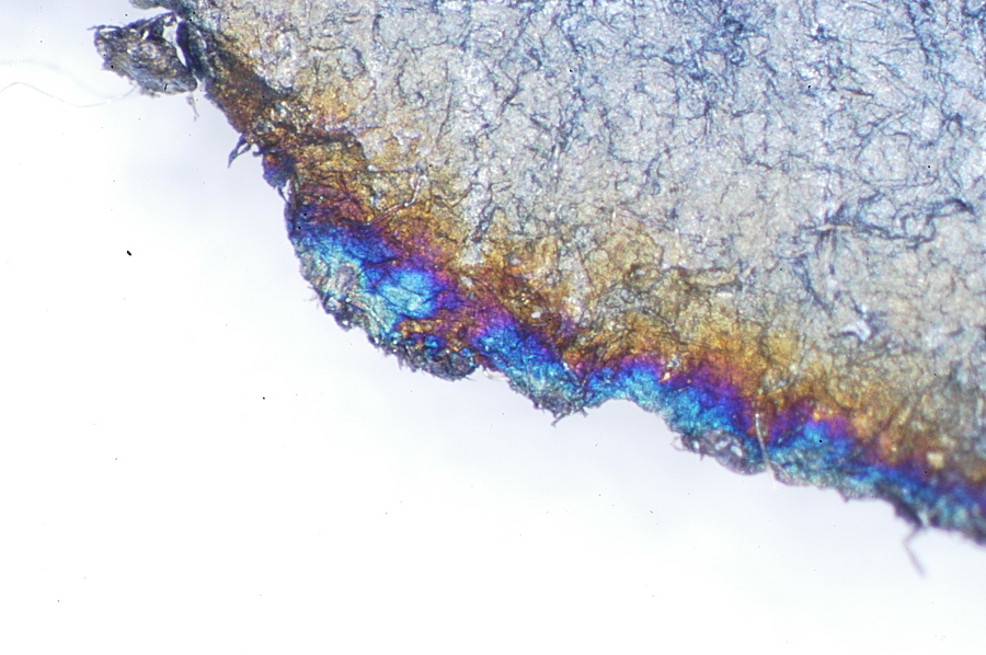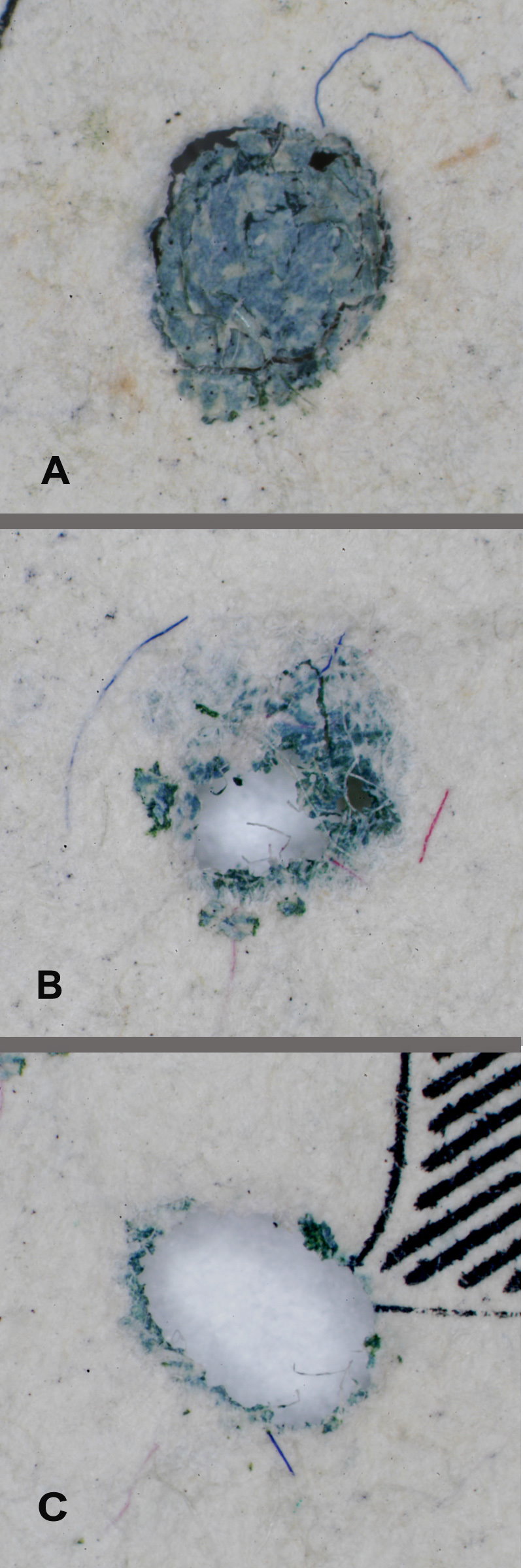Microscopic examination showed that the Cooper bills were severely degraded at the edges and had holes in many places. The holes were examined closely to determine if they were insect boring’s, root holes or bacterial colonies. Enough holes were present in various stages of decomposition that it could be determined that the holes were not clean cuts from insects, but appeared to start as a color change (Fig. 1A) progressing to shredding of the fibers (Fig. 1B), and finally to all the fibers in the hole disappearing (Fig. 1C). This is most consistent with a bacterial colony that is consuming the paper.