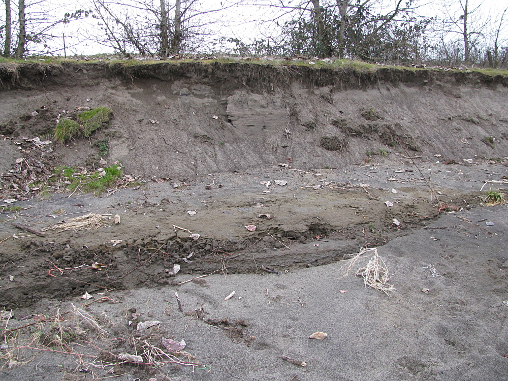 The eroded beach now clearly exposed several continuous layers of consolidated clay alternating with clean sand (Fig. 1). Measurements based on the level of the grass at the top of the beach and the exposed tree roots (Fig. 2) indicated that the now-exposed clay layers were at the same approximate depth as Palmer’s original trench.