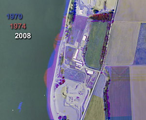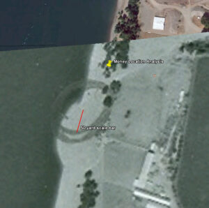 FBI records of the dredging operation in 1974 at Tena Bar stated that the dredging spoils were pushed 50 yards in each direction [2]. Aerial photos from 1974 showed the center of the dredge spoil pile on the beach (Fig. 3). This data combined with the re-location of the money find allowed a reconstruction of the 50 yard limit of the dredging sand. See Tena Bar for a more complete discussion.