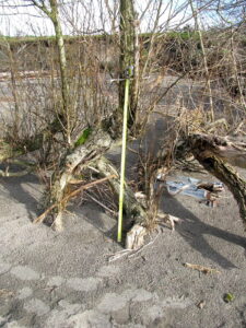 The Cooper Research Team went to Tena Bar in March of 2009 and found that the beach had undergone severe erosion. The level of the beach was now several feet below its original level. This was evident from the exposed roots of large and small trees higher on the beach (Fig. 2). The largest trees had come loose and washed down river. One large tree was left from the original 1980 photographs which had fallen over but stayed in place. This tree and the original dirt road running along the beach were used to recover the original find location.