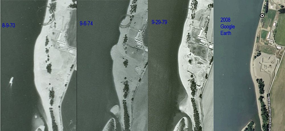 The discovery of the natural clay layers suggests that Palmer misinterpreted the clay as man-made when it fact it was a natural part of the beach stratigraphy. Palmer working with limited information could not have interpreted the clay layers as a natural feature of the shoreline. The continuous erosion of the sand since 1980 to its current level (Figs. 4,5), suggests that prior to 1974, the level of the beach was maintained by the addition of dredging sands. These sand deposits can be seen in subsequent years moving downstream with river flow along the sand bar. This further suggests that once the dredging sands were no longer replenishing the beach after 1974, natural erosion took place which eventually uncovered the Cooper Bills in 1980.