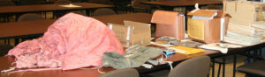 The pink parachute removed from the canvas reserve container was untangled and Original twenty dollar bill from the money find on Tena Bar. Initials in pen represent the FBI agent who confirmed the serial number match to the Cooper bill list.the cut shroud lines inspected. The record shows conflicting numbers of either two or three parachute cords that were cut. At the time of inspection it was discovered that, five cords were missing from the chute. It is not known if the original reported number was wrong, or if cords were removed subsequent to the recovery of the parachute. The canvas container had been completely severed from the parachute. Inspection of the ends of the cords shows that each cord had been individually tied to a rope backbone in the container. Each of the cords had been individually separated from the backbone by slicing through the knot with a knife. The transcripts describe Cooper having a pocket knife in his possession during the hijacking. The reserve container was obviously too small to contain the entire bundle of money and the extra time he took to sever each knot instead of cutting the cords wholesale remains an enigma.