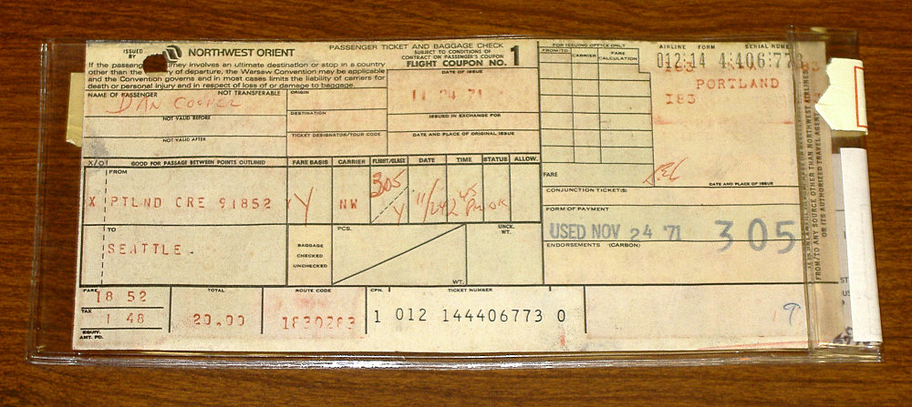 The placard [5] that was recovered from the woods north of Portland, remains in the custody of the local police department where it was found. The placard was not examined but the original find location was confirmed in conversation with the original discoverers and is outlined further in the Flight Path part of this study.D.B. Cooper physical evidence in Seattle, WA.