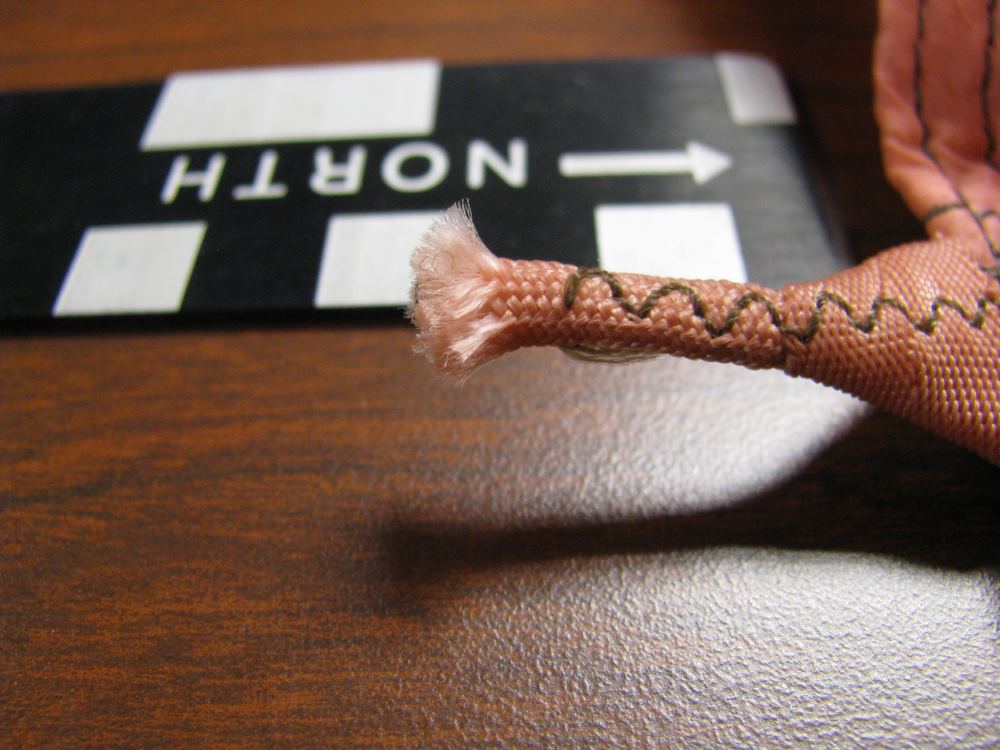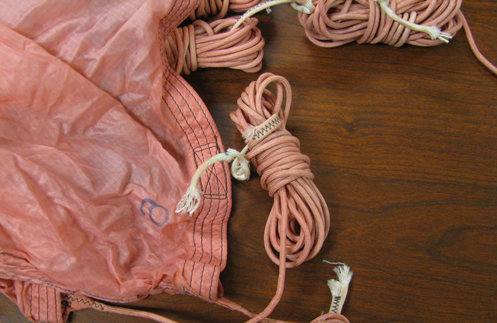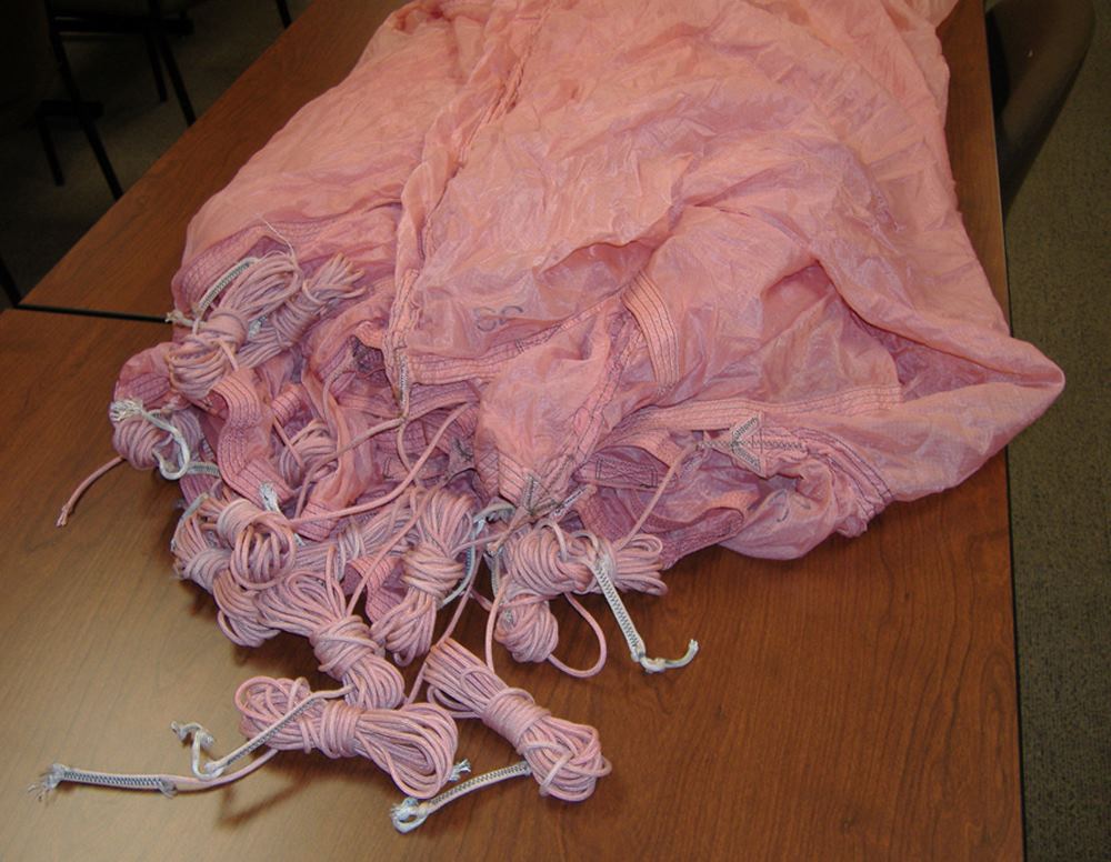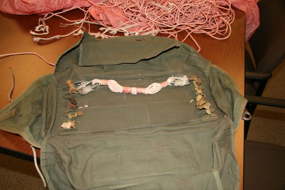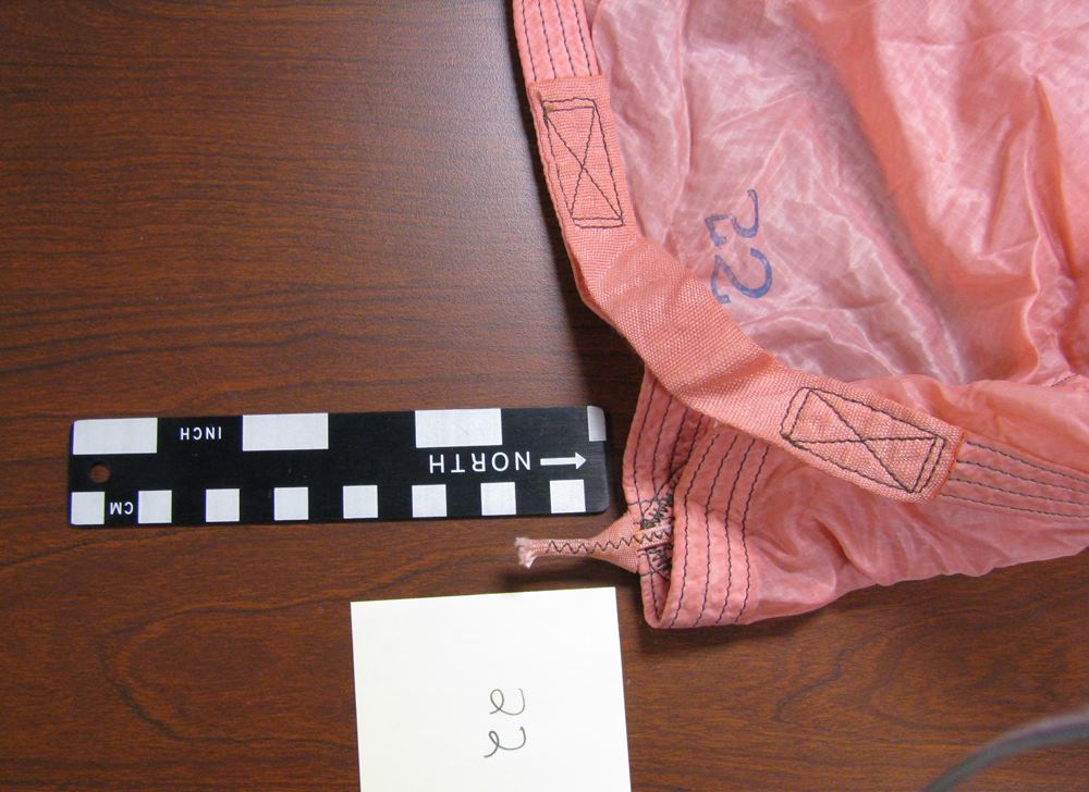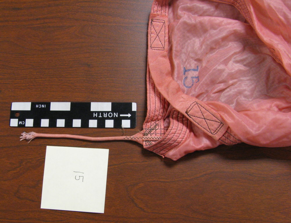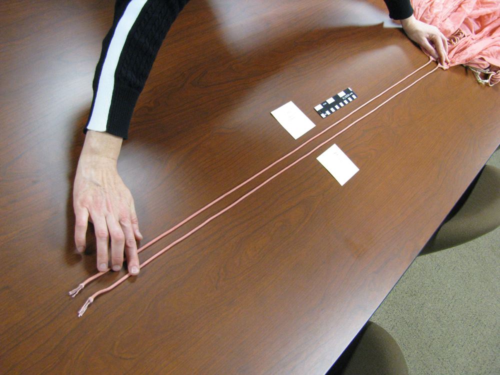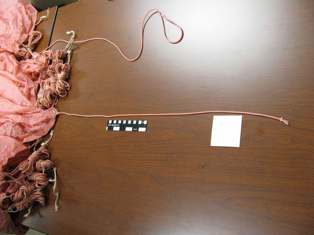 Because it is thought that Cooper tied the bank-type bag to his waist using shroud lines (suspension lines) cut from the pink parachute [1, 3], a careful inspection of the parachute was conducted during the Teams visit to the FBI Archive in 2009. All 24 shroud lines were untangled in 1.5 man-hours and each line was rolled into a tight bundle for easier inspection. The individual suspension lines were examined and upon careful observation, it was discovered that five shroud lines had been removed from the pink parachute. Each cut line had a markedly different length removed, except for two – lines #11 and #12. Measurements were taken of each cut cord and lines #11 and #12 resulted in a difference of only ¼ inch (6.5 mm). The lengths of each cut line were compared to the measurements taken of the overall uncut lines, in order to determine the exact amount of cord removed from each separate line.