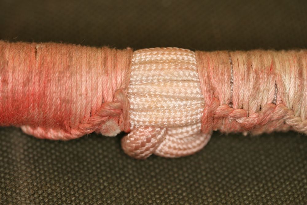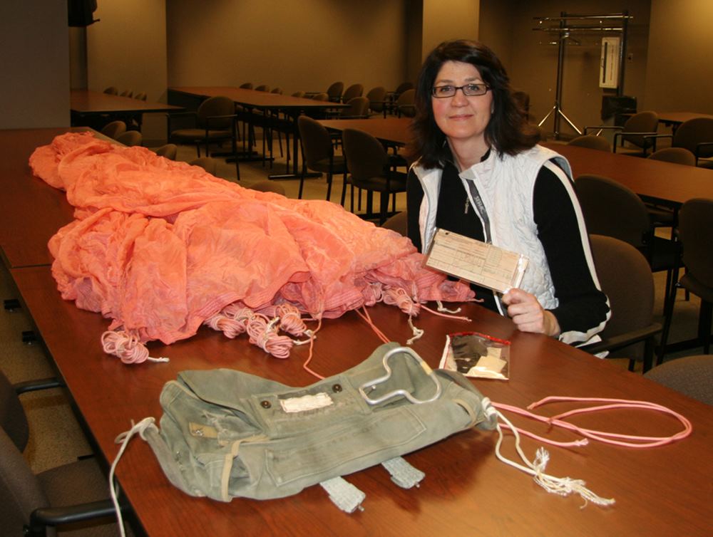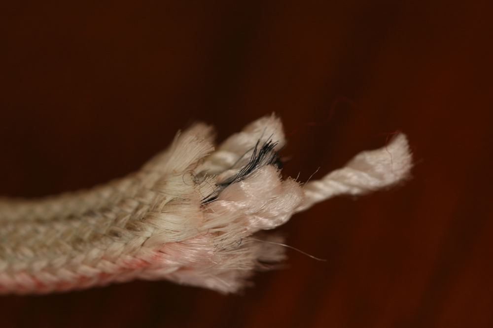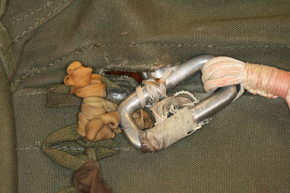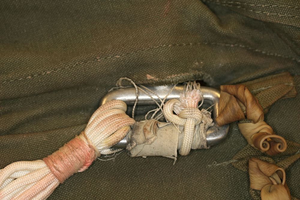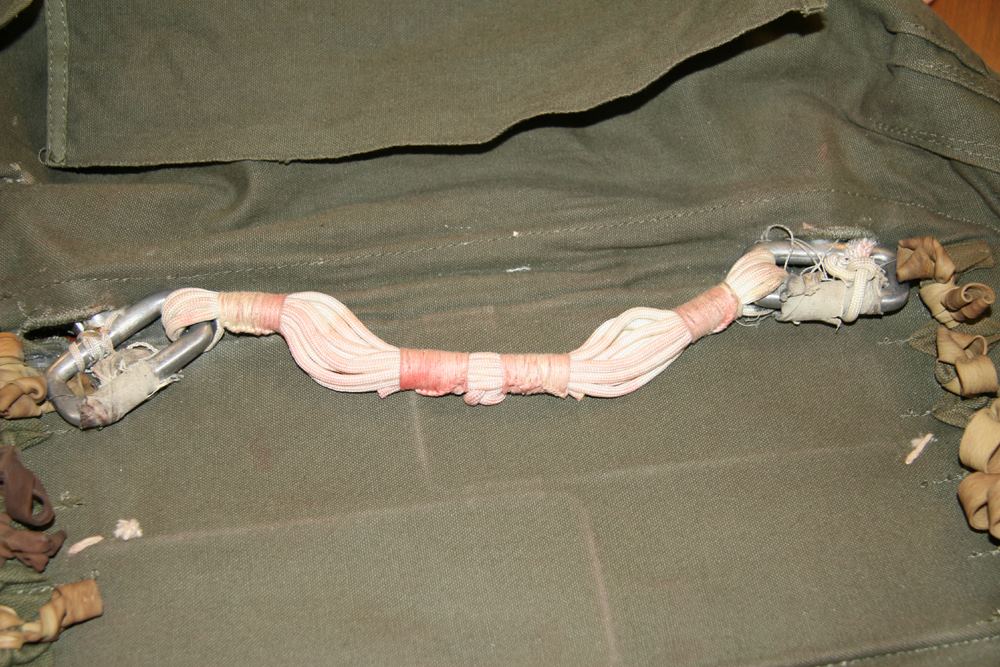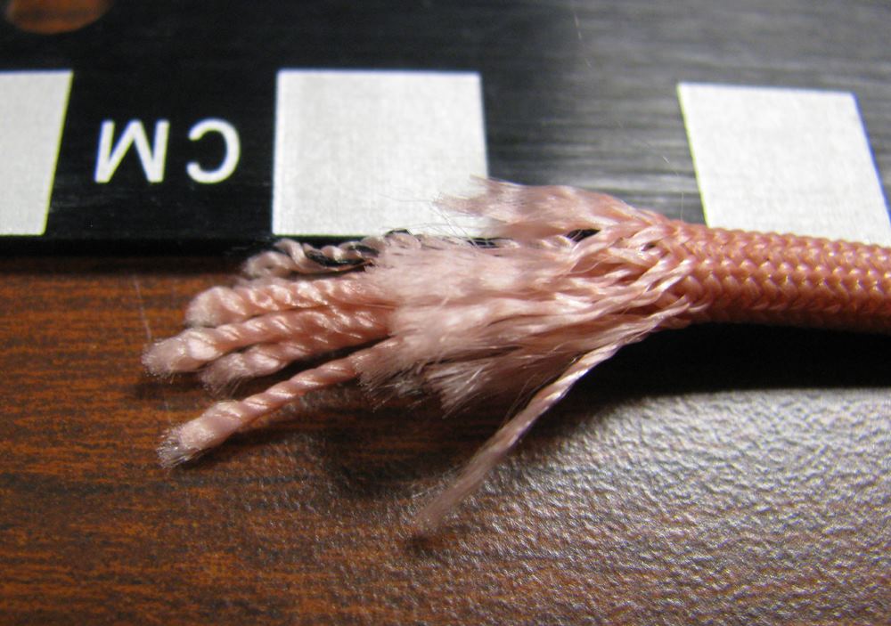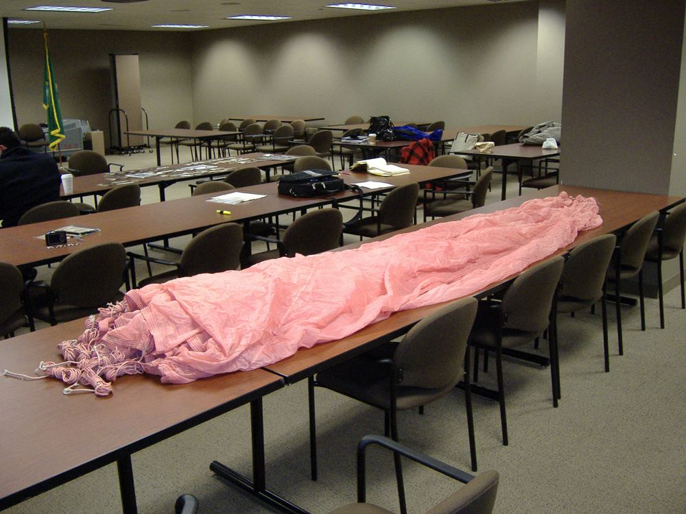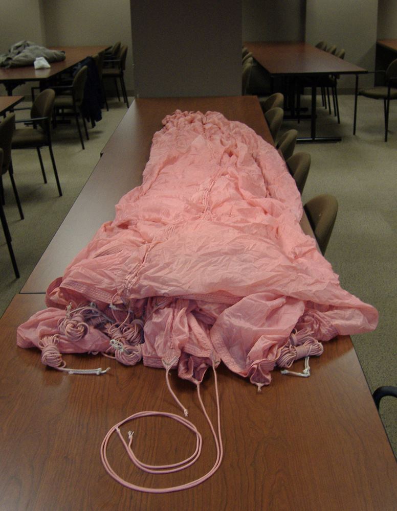 Because it is thought that Cooper tied the bank-type bag to his waist using shroud lines (suspension lines) cut from the pink parachute [1, 3], a careful inspection of the parachute was conducted during the Teams visit to the FBI Archive in 2009. All 24 shroud lines were untangled in 1.5 man-hours and each line was rolled into a tight bundle for easier inspection. The individual suspension lines were examined and upon careful observation, it was discovered that five shroud lines had been removed from the pink parachute. Each cut line had a markedly different length removed, except for two – lines #11 and #12. Measurements were taken of each cut cord and lines #11 and #12 resulted in a difference of only ¼ inch (6.5 mm). The lengths of each cut line were compared to the measurements taken of the overall uncut lines, in order to determine the exact amount of cord removed from each separate line.