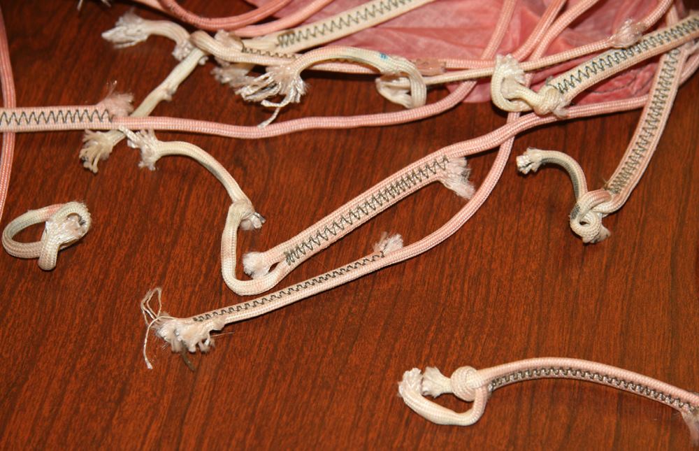 Five cords on the pink parachute had cut lines: