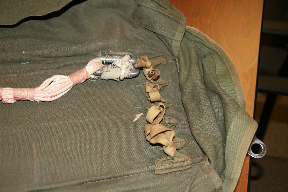 1. FBI Transcript: “MUCKLOW advised that when she returned with the second back parachute, the hijacker was cutting open one of the chest parachutes with a pocketknife and cut some of the nylon cords. He then took the nylon cord, wrapped it around the neck of the money bag numerous times and then wrapped it a few times from top to bottom. With the same piece of nylon, he then made a loop-like handle at the top.”
