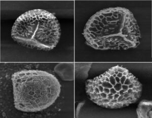 A few spores were found in the 2009 sample sets and these were most similar to the Impatiens family. Impatiens has more than 1,000 species so pictures were sent to Dr. Steven Janssens in Belgium for identification. Dr. Janssens found the closest match to be Impatiens immani from Africa but this was based on limited views of the pollen. Subsequent samples from 2011 clearly showed the trilete aperture (Fig. 1 top row) which is specific to spores and allowed the firm identification of Lycopodium clavatum. Lycopodium in 1971 was used as flash powder by magicians, had a role in the then small field of homeopathy, for skin and stomach maladies, and was used as an anti-sticking agent in pills [1].