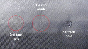 It was observed that the tie clip found with the tie, left marks on the back of the tie once removed. There were very few of these marks indicating that the current tie clip was not removed and replaced very often. The permanent depression left in the tie, by the now absent tie tack, suggested that a single tie tack was present on the tie for an extended period of time.