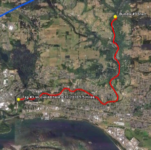 One of the deployed bundles had it’s note recovered by a member of the public eighteen months after release (Fig. 2). The rubber bands and money had become separated from the tag and were not recovered. The tag was recovered in a shallow water area close to the mouth of the Columbia after traveling 5.5 miles (Fig. 3). The bundle did not survive the trip intact, suggesting that the rubber bands degraded and came loose over this time period which is considerably less than the 3-4 years required for the Washdown Theory.
