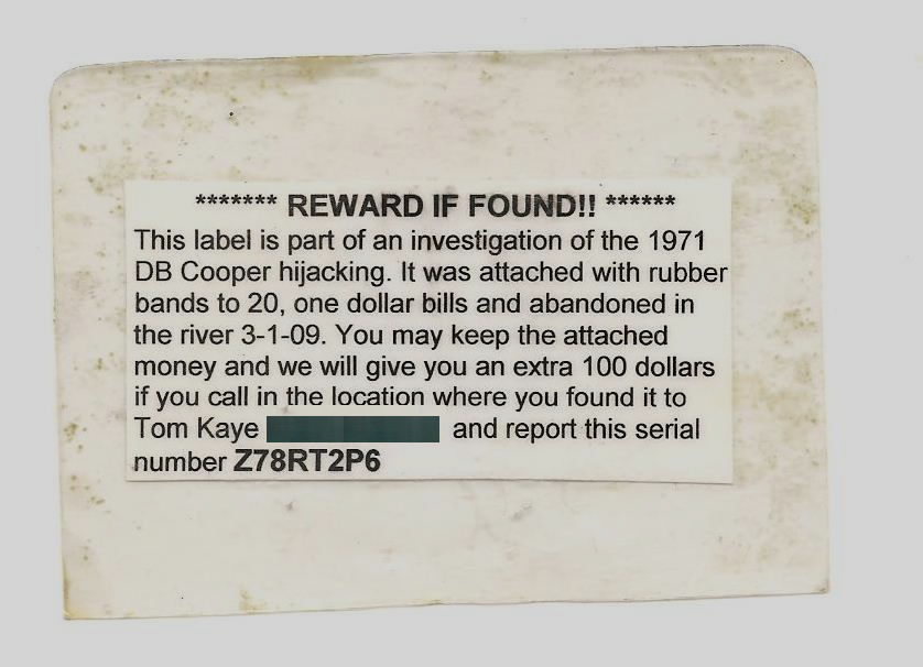 Experiment # 2, three individual bundles of twenty, one dollar bills with a reward note attached (Fig. 2) were bound with rubber bands similar to the ones available to banks in 1971. Each bundle had a unique serial number and contact information on the attached note. The bundles were released into the river at three points varying between approximately five to 10 miles from the Columbia River.